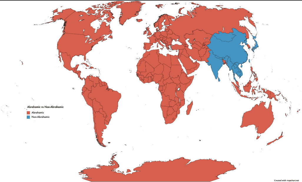 Shown above is the Abrahamic religions map. This shows which countries in the world predominantly practice an Abrahamic religion, shown in red, and those who do not, marked in blue. The Abrahamic religions include Christianity, Islam, Judaism, and the Bahá’i Faith. Meanwhile, the non-Abrahamic religions include Buddhism, Hinduism, and Shintoism.