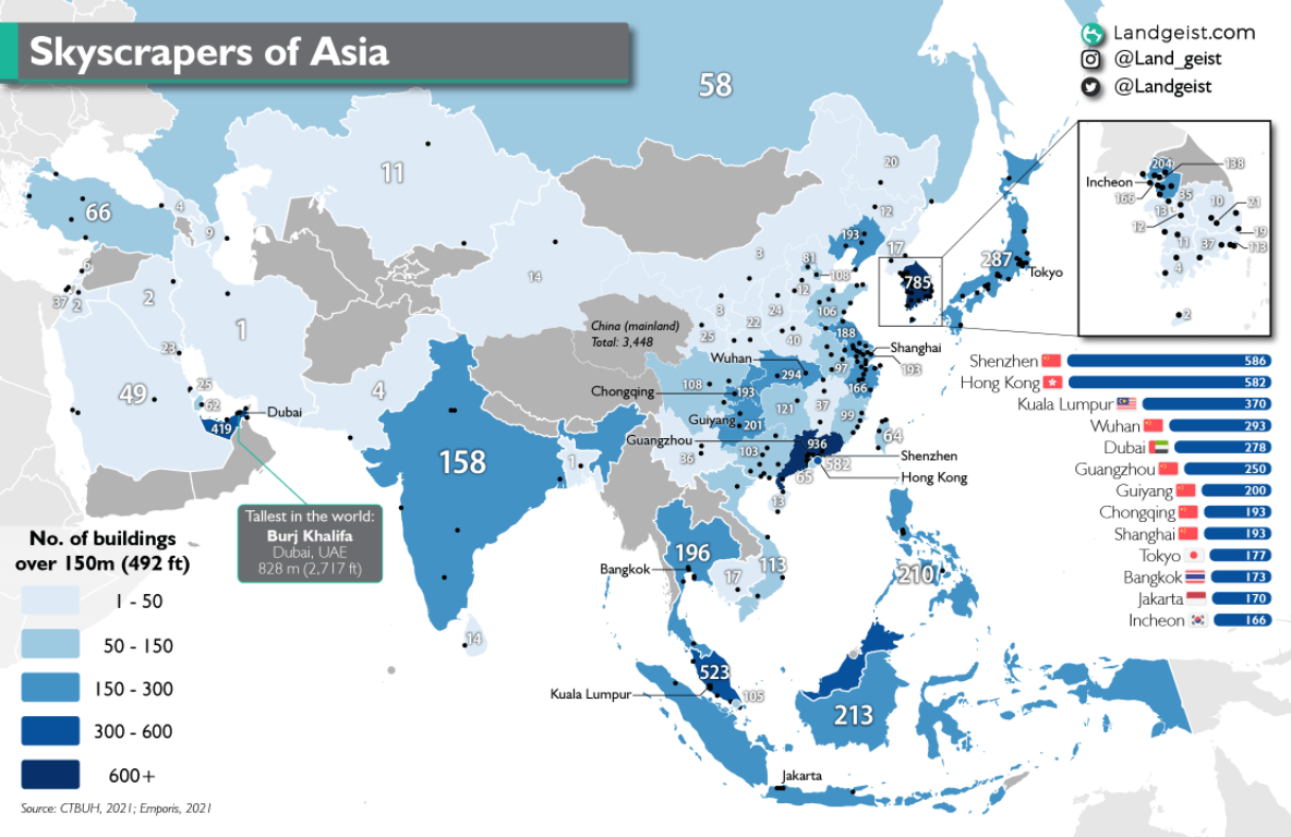 This is a map of Asia detailing the number of skyscrapers in every country.