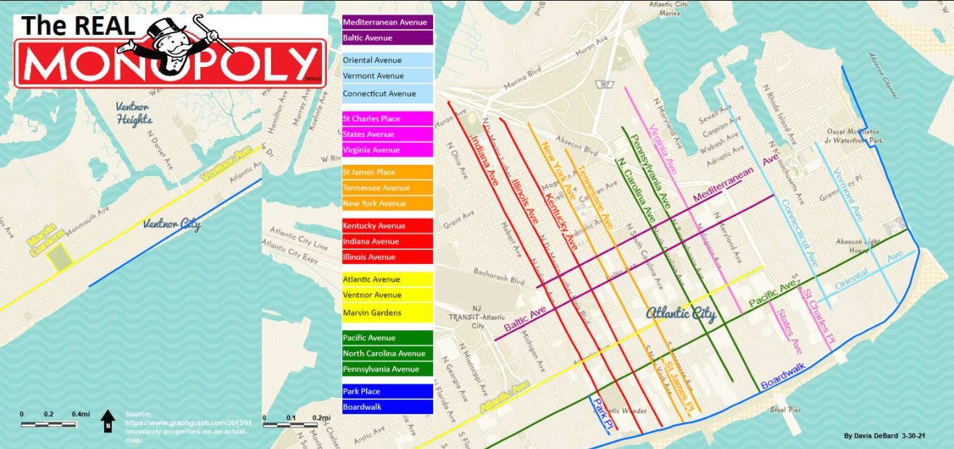 The maps above are those of Atlantic City and Ventnor City in New Jersey, United States. These cities are largely influential in the American version of the board game Monopoly.