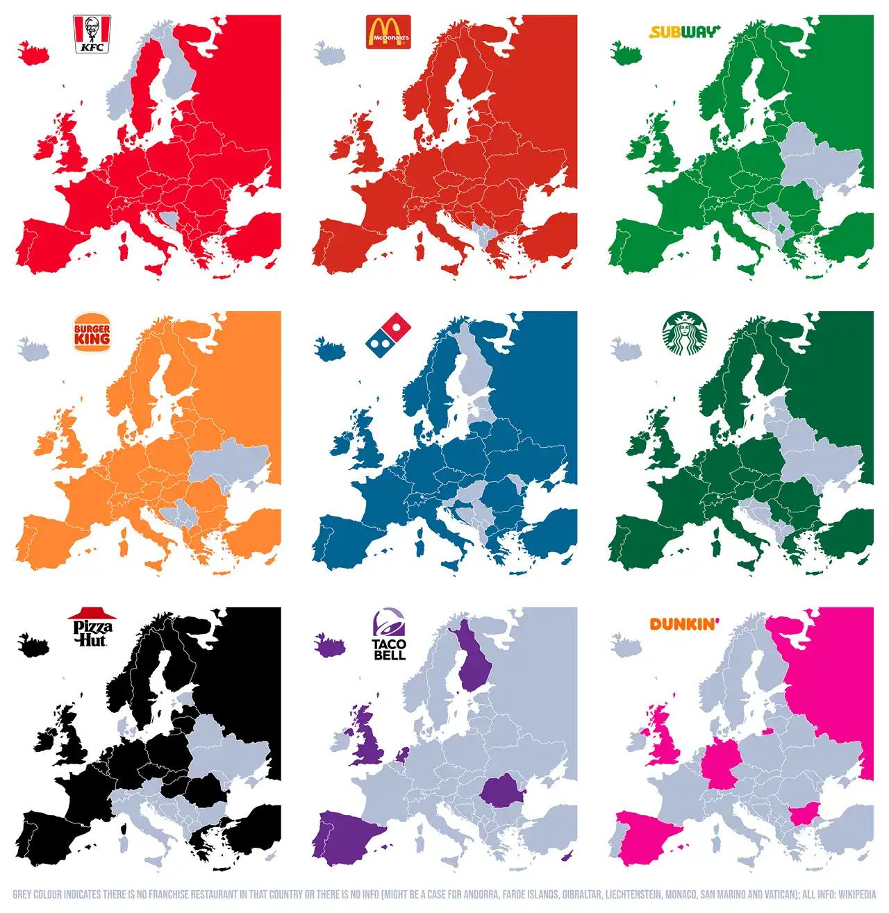 The map above tracks the presence of nine major American fast food chains across European countries: KFC, McDonald’s, Subway, Burger King, Domino’s, Starbucks, Pizza Hut, Taco Bell, and Dunkin’.