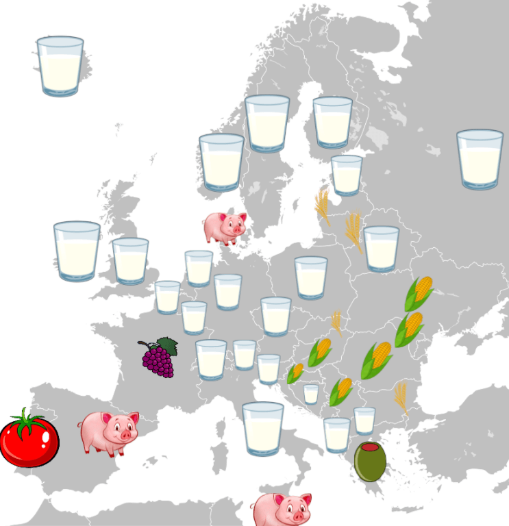 This is a map of Europe detailing each country’s largest agricultural products.
