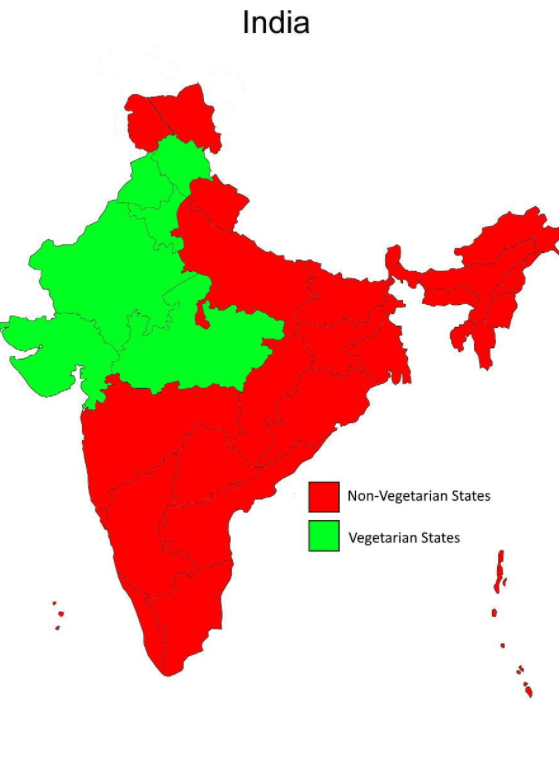 This is a map of India indicating the states that have more vegetarians or non-vegetarians.