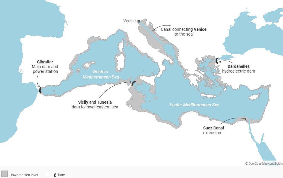 This is a map of the Mediterranean Sea, located within southern Europe, northern Africa, and Western Asia. The highlighted portions on the map depict the additional land space of what was supposed to be the Atlantropa project proposed in the first half of the 20th century.