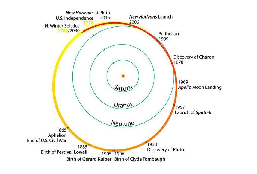 Pluto takes 248 Earth years to complete one orbit. The discovery of this icy dwarf planet in 1930 came at a point when America was already well established, and even today, Pluto hasn’t returned to where it was when Clyde Tombaugh first spotted it through his telescope.