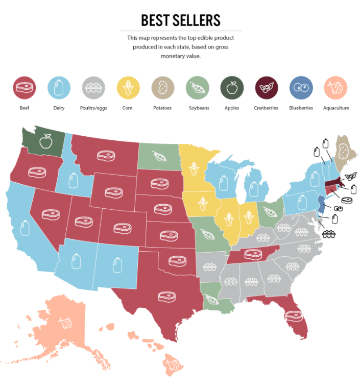 Meanwhile, corn and soybeans are mainly produced by four U.S. states each. Alaska and Hawaii are large contributors to aquaculture (fish and related products). Washington produces the most apples, New Jersey the most blueberries, Massachusetts the most cranberries, and Maine the most potatoes.