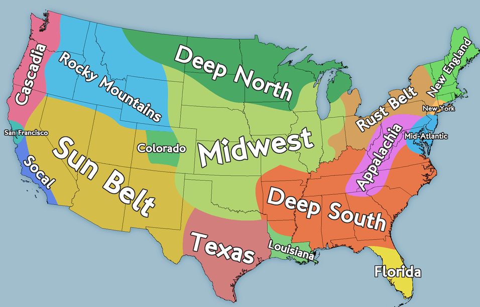 California also has two unique cultural regions: San Francisco (teal) and Socal (short for Southern California, in royal blue).